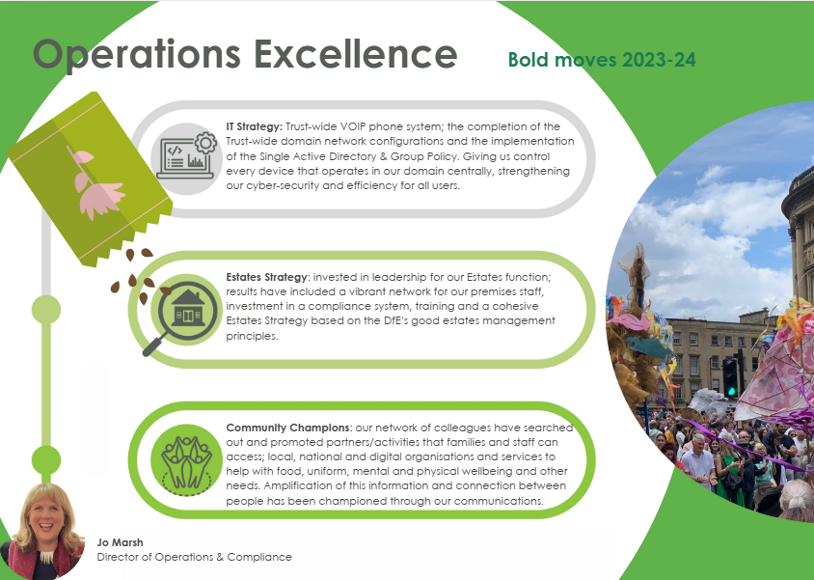 Led by Jo Marsh, Director of Operations & Compliance, the team consists of professionals and partners for Communications, Governance, IT, Estates, Safety, Data Protection, Procurement and Audit. Our Operations Excellence teams recognise that barriers and vulnerabilities are different for all schools and learners, but the solution can be found collectively. This work supports our culture of collective efficacy and helps everyone appreciate their responsibility to all our pupils.