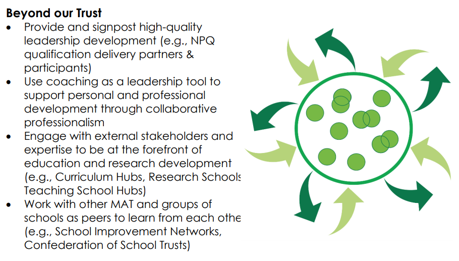 Being a strong Trust means having a family of schools with colleagues who have good knowledge, expertise, and skills in their areas of responsibility, be they pupil-facing or non-pupil-facing colleagues. We recognise that every class needs a great teacher, and every school needs good leadership, but we feel this goes beyond the classroom to include all colleagues and governors. We also believe in the power of self-directed learning and the role of the individual in self-determination. Our commitment is to ensure all colleagues feel invested in and valued through our strong professional development offer, driven by a learning culture for all. As such our Education Excellence team focuses concurrently on three stages of school improvement and sustainable development: within our schools, across our Trust, and beyond our Trust.